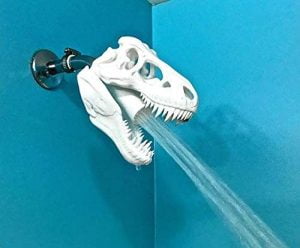 Shower Upgrade Check out this shower upgrade! Amazon has this dinosaur shower head in sixteen different colors to match your kid’s bathroom. Who knows maybe